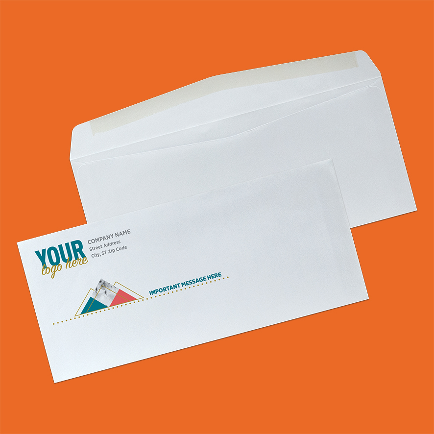 - Print: Flat Ink (CMYK) for vibrant custom full color envelopes
